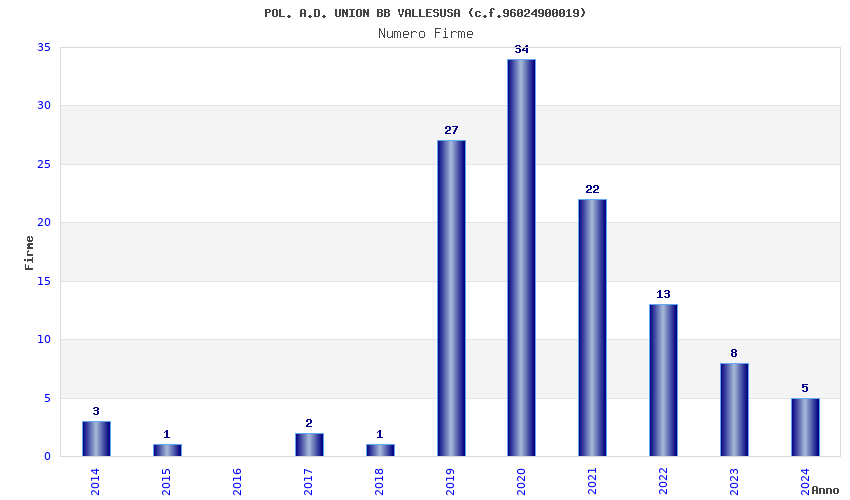 | Anno | Firme | Importi | Media | Naz. | Reg. | Prov. | Comu. |