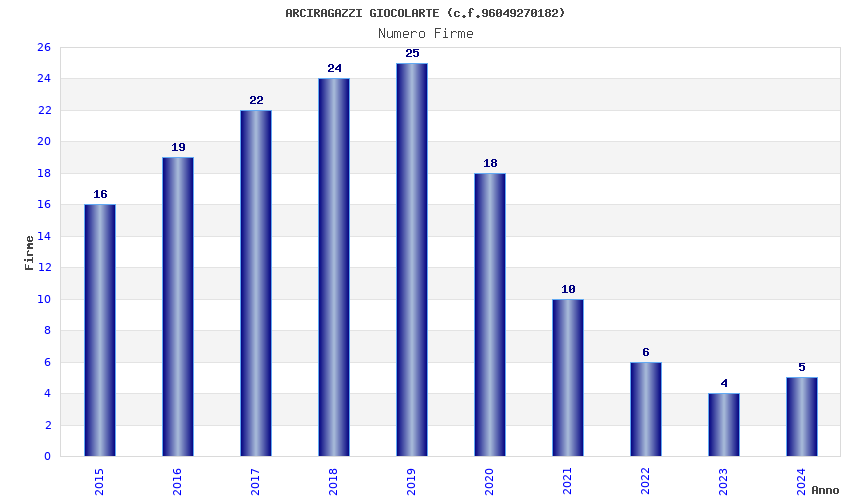 | Anno | Firme | Importi | Media | Naz. | Reg. | Prov. | Comu. |