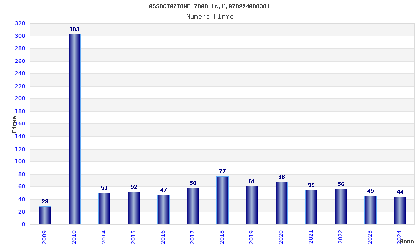 | Anno | Firme | Importi | Media | Naz. | Reg. | Prov. | Comu. |