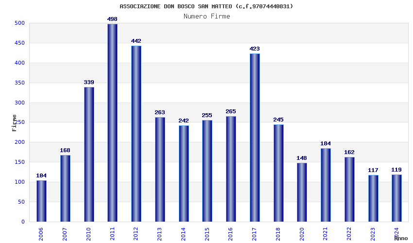 | Anno | Firme | Importi | Media | Naz. | Reg. | Prov. | Comu. |