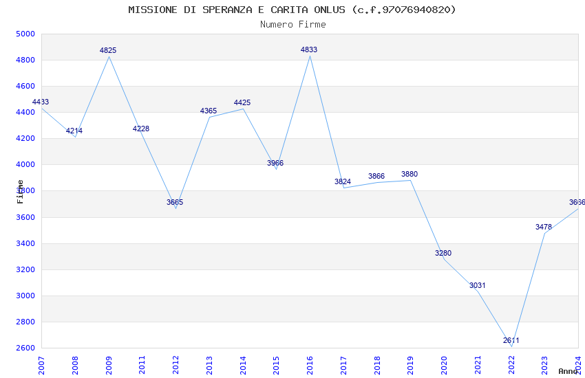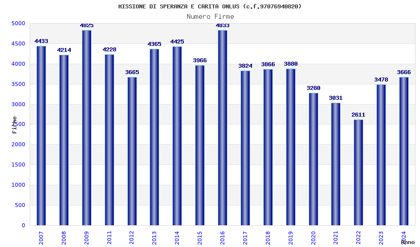 | Anno | Firme | Importi | Media | Naz. | Reg. | Prov. | Comu. |