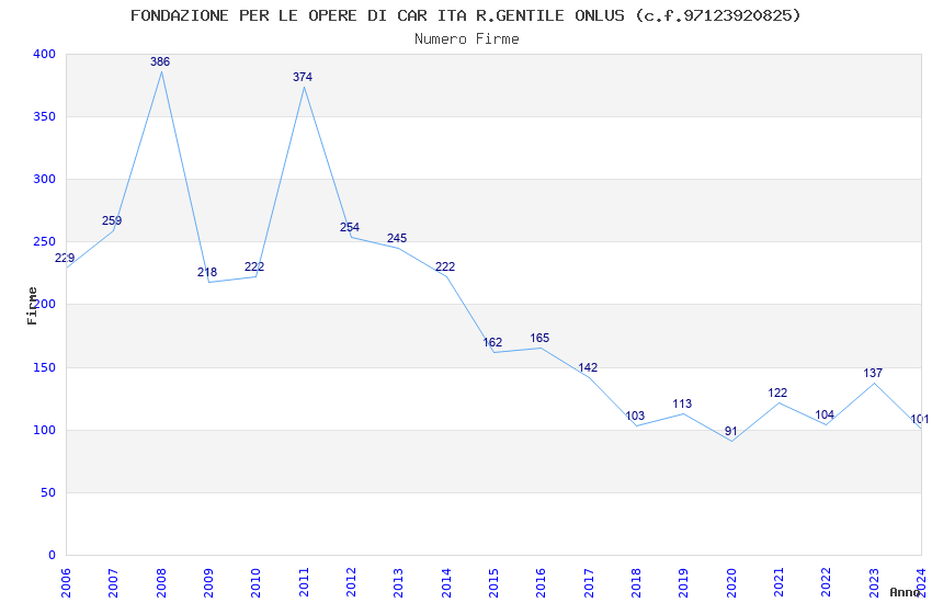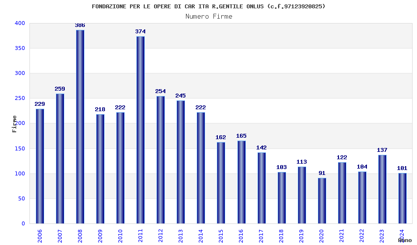 | Anno | Firme | Importi | Media | Naz. | Reg. | Prov. | Comu. |