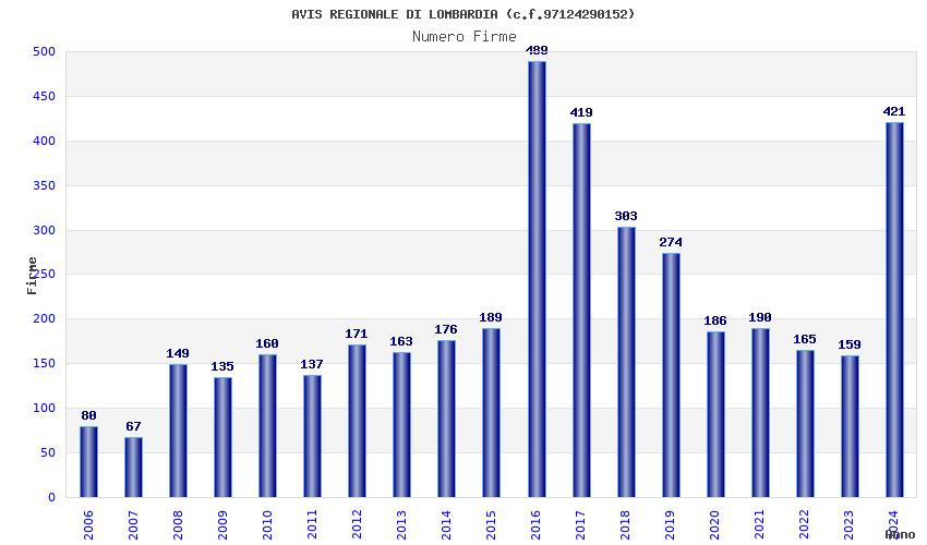 | Anno | Firme | Importi | Media | Naz. | Reg. | Prov. | Comu. |