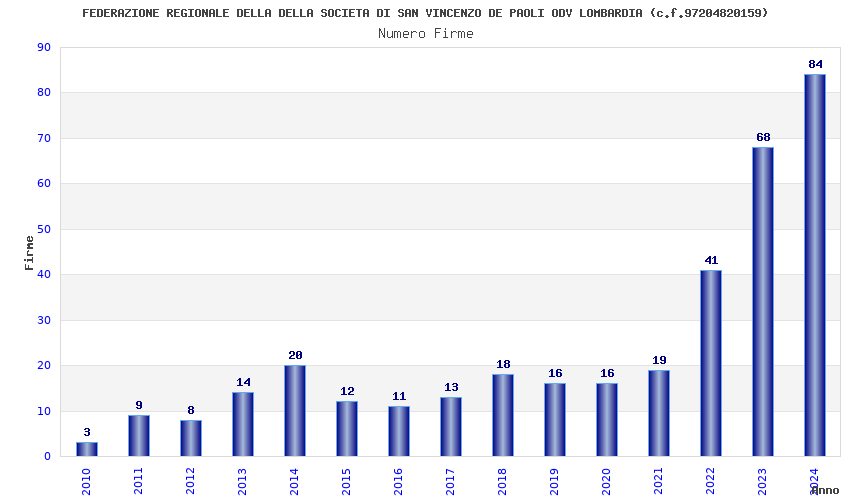 | Anno | Firme | Importi | Media | Naz. | Reg. | Prov. | Comu. |