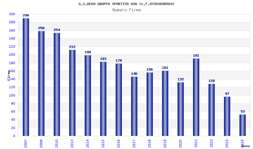 | Anno | Firme | Importi | Media | Naz. | Reg. | Prov. | Comu. |