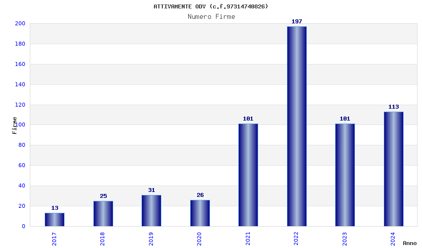 | Anno | Firme | Importi | Media | Naz. | Reg. | Prov. | Comu. |