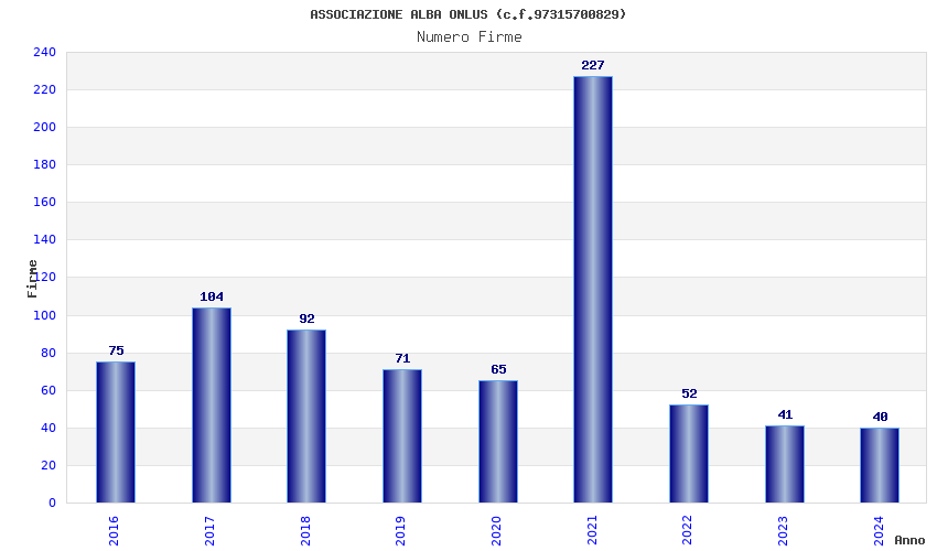 | Anno | Firme | Importi | Media | Naz. | Reg. | Prov. | Comu. |