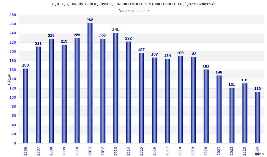 | Anno | Firme | Importi | Media | Naz. | Reg. | Prov. | Comu. |