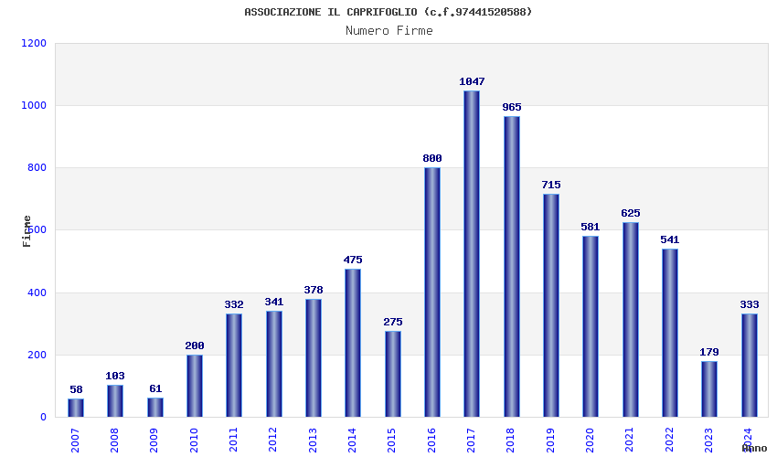 | Anno | Firme | Importi | Media | Naz. | Reg. | Prov. | Comu. |