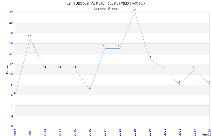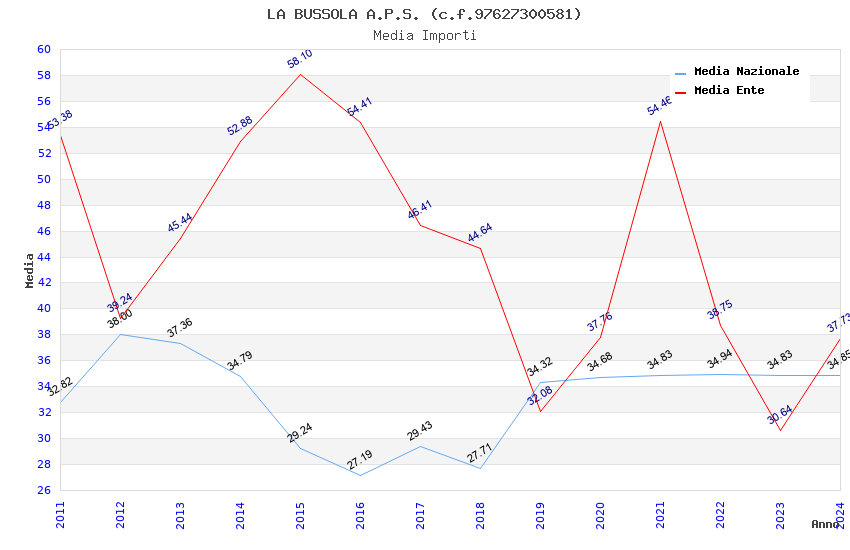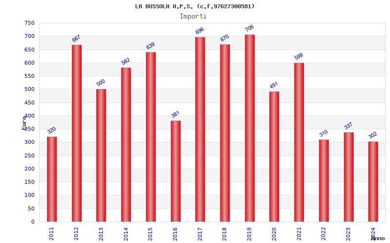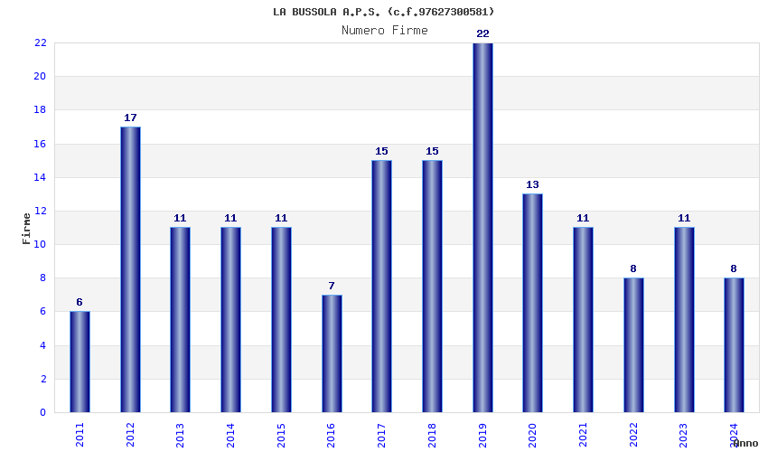 | Anno | Firme | Importi | Media | Naz. | Reg. | Prov. | Comu. |