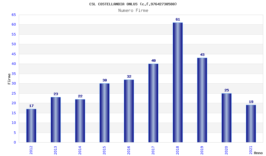 | Anno | Firme | Importi | Media | Naz. | Reg. | Prov. | Comu. |