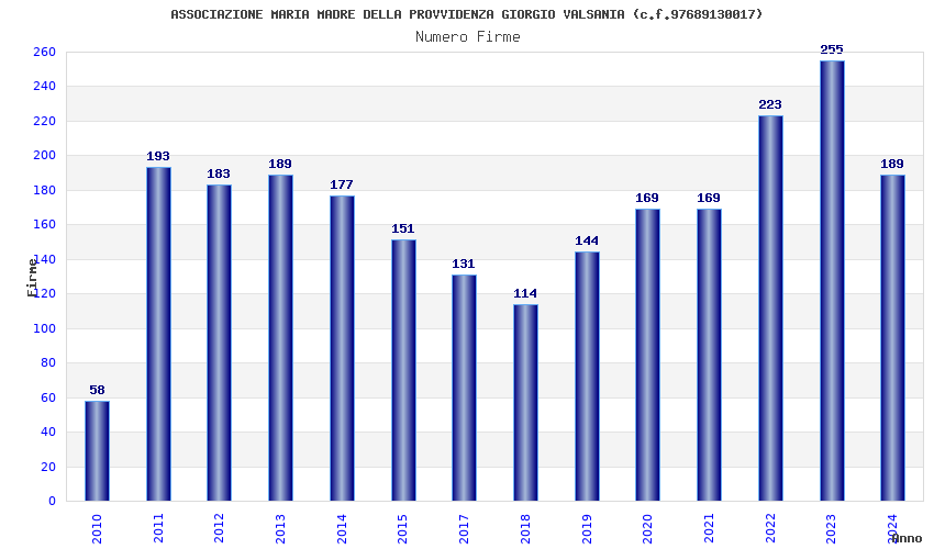 | Anno | Firme | Importi | Media | Naz. | Reg. | Prov. | Comu. |