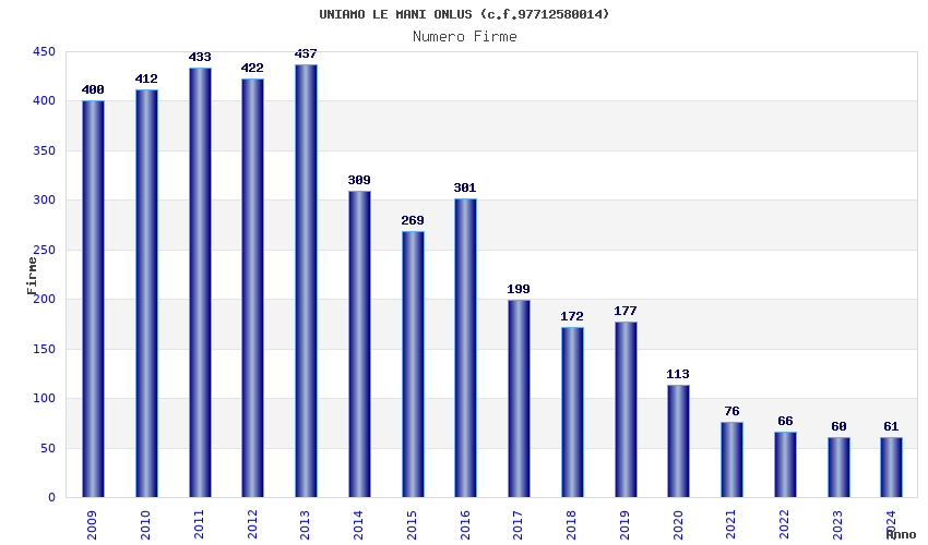 | Anno | Firme | Importi | Media | Naz. | Reg. | Prov. | Comu. |
