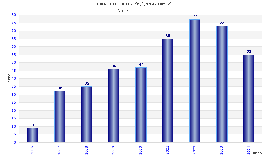 | Anno | Firme | Importi | Media | Naz. | Reg. | Prov. | Comu. |
