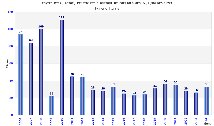 | Anno | Firme | Importi | Media | Naz. | Reg. | Prov. | Comu. |