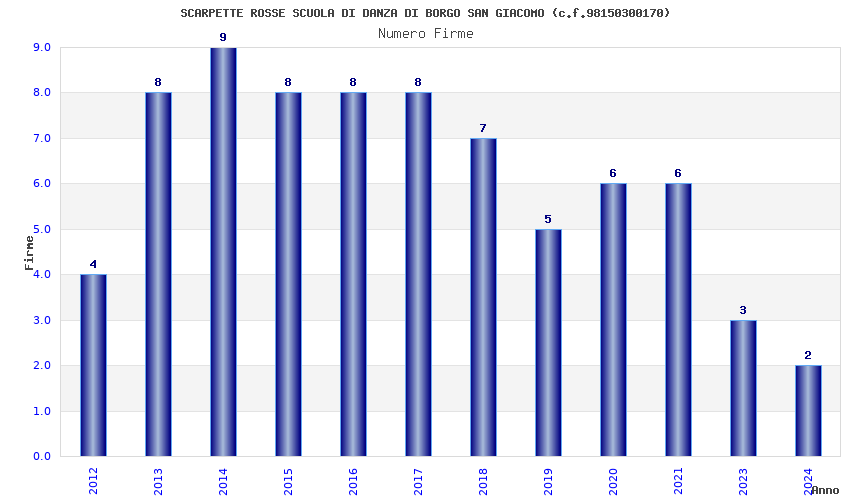 | Anno | Firme | Importi | Media | Naz. | Reg. | Prov. | Comu. |