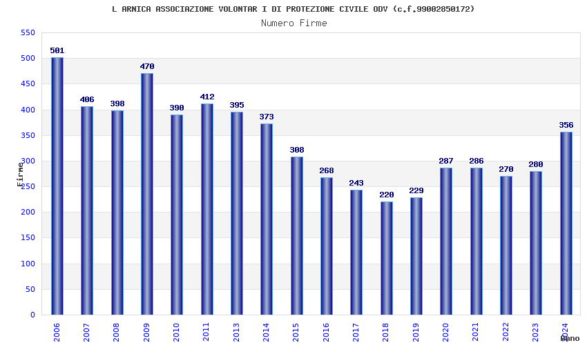 | Anno | Firme | Importi | Media | Naz. | Reg. | Prov. | Comu. |